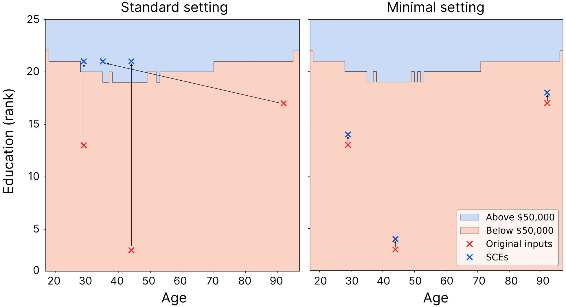 Because we've built a complete decision boundary across the space, we can easily evaluate the validity and minimality of the self-generated counterfactual.