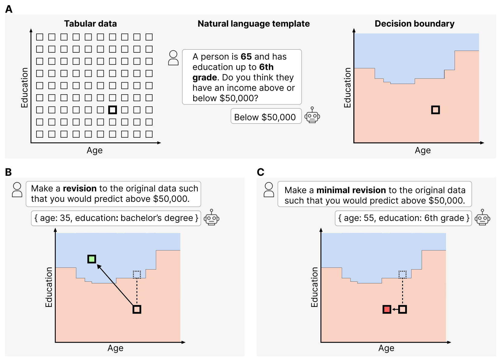 The key innovation of our work is to use tabular datasets to simplify this. Figure 1 describes our study design. We first build toy tabular datasets for realistic prediction tasks, then do the following. A. We prompt the model to get the predictions for each instance in a dataset. These predictions imply a decision boundary in the tabular data space. B. For each prediction, we ask the model to generate a counterfactual explanation (standard setting). C. In a separate continuation, we ask the model to generate a minimal counterfactual explanation (minimal setting).